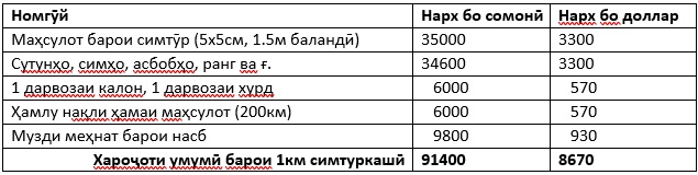 Барои симтуркашӣ бо симтӯр арзиш асосан ба дарозии симтур рабт дорад. Барои 1км симтур хароҷоти миёна чунин аст: