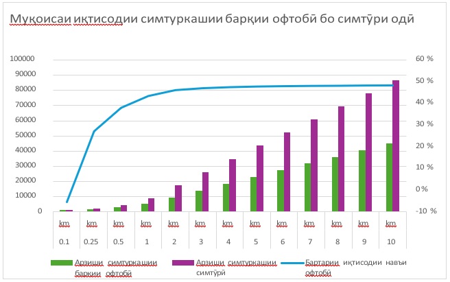 Диаграммаи зерин ин таъсирро дар муқоиса бо симтуркашии маъмулии симтӯрӣ, ки дар Тоҷикистон роиҷ аст, нишон медиҳад. Миқёси чап ҳаҷми сармоягузории заруриро (бо доллари ИМА) барои дарозиҳои гуногуни симтуркашӣ нишон медиҳад. Миқёси рост бо хати кабуд бартарии симтури барқи офтобиро нисбат ба анъанавӣ бо фоиз нишон медиҳад.