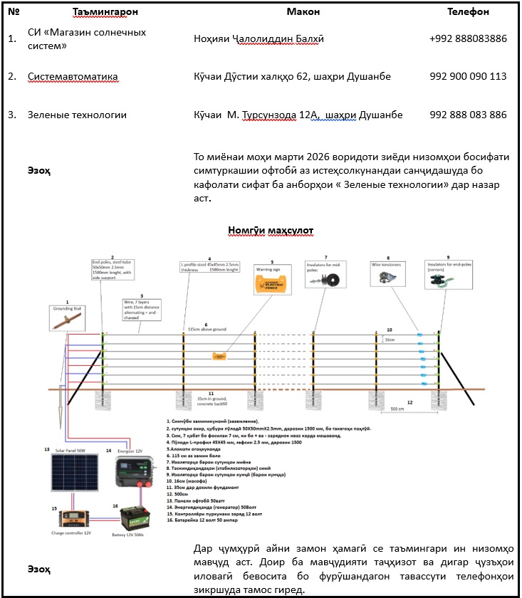 Низоми симтури барқии офтобӣ дар деҳаи Чашмасори ноҳияи Мӯъминоод